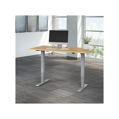 Bush Business Furniture Move 40 height-adjustable desk is a perfect way to build an ergonomic workspace without the high-end price tag. Give your body and mind a break from sedentary work and enjoy a healthier, more productive office with the push of a button. Three-stage units lift the 59.45″ x 29.37″ desktop anywhere from 28.17″ to 48.24″ at a speed of 1.25″ per second so you can change positions without missing a beat. The adjustable desk also features an anti-collision sensor that stops movement up or down if an object is detected. Available in your choice of five finishes, the durable thermally fused laminate work surface resists scratches and stains while a welded 16-gauge steel base allows the desktop to support up to 176 lbs. Sit-stand desk meets or exceeds ANSI/BIFMA standards for safety and performance and is backed by a 5-year manufacturer limited warranty.