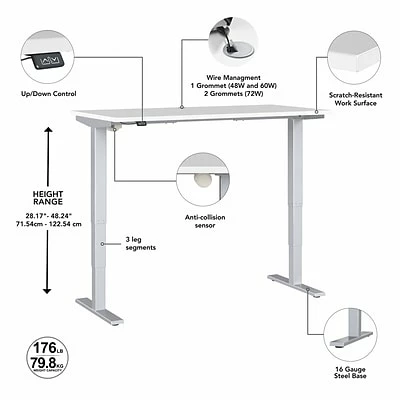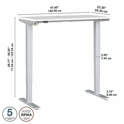 This Bush Business Furniture Move 40 height-adjustable standing desk is a great way to build a healthy and productive ergonomic office without a high-end price tag. Give your body and mind a break from sedentary work and enjoy a healthier, more productive office with the push of a button. Three-stage units lift the 48″W x 23″D desktop anywhere from 28.17″ to 48.24″ from the floor at a speed of 1.25″ per second so you can change positions without missing a beat. The adjustable desk also features an anti-collision sensor that stops movement up or down if an object is detected. The durable thermally fused laminate work surface resists scratches and stains while a welded 16-gauge steel base allows the desktop to support up to 176 lbs. This sit-stand desk is tested to meet ANSI/BIFMA standards for safety and performance and is backed by a 5-year manufacturer limited warranty.