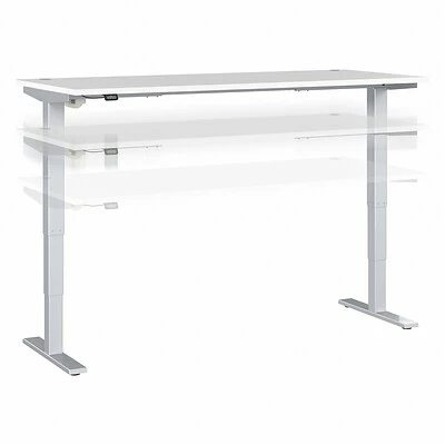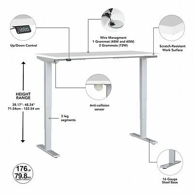 Bush Business Furniture’s Move 40 height-adjustable standing desk is a perfect way to build an ergonomic workspace without a high-end price tag. Give your body and mind a break from sedentary work and enjoy a healthier, more productive office with the push of a button. Three-stage units lift the 71″ x 29″ desktop anywhere from 28″ to 48″ at a speed of 1.25″ per second so you can change positions without missing a beat. The adjustable desk also features an anti-collision sensor that stops movement up or down if an object is detected. The durable thermally fused laminate work surface resists scratches and stains while a welded 16-gauge steel base allows the desktop to support up to 176 lbs. This sit-stand desk is tested to meet ANSI/BIFMA standards for safety and performance and is backed by a 5-year manufacturer warranty.