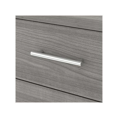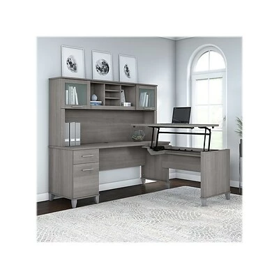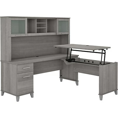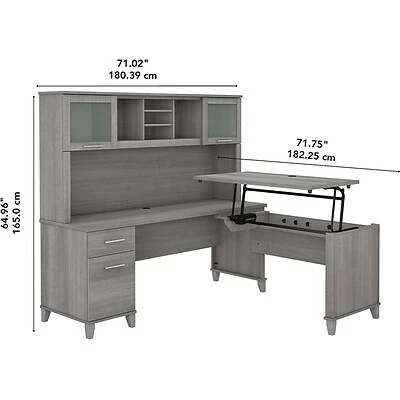 The Bush Furniture Somerset 72″W three-position sit to stand L-shaped desk with hutch offers a perfect solution for those seeking for a stylish and functional ergonomic workspace. The built-in mechanical Lift-n-Lock system allows the desktop to lock into place at standing heights of 35″, 38″, and 41″ and easily return to a seated position. This office desk includes a file drawer that opens on full-extension ball bearing slides for easy access to legal- and letter-size documents and a box drawer for supplies and utensils. The hutch attaches to the desktop and adds two frosted glass doors for concealed storage in addition to open cubby spaces with two shelves. Fixed surfaces are tested to meet ANSI/SOHO standards for safety and performance while the mechanical lift is rigorously tested to Bush Furniture quality standards.