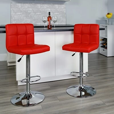 Let the plush quilted design of this this red adjustable height barstool cradle you in comfort. The simple design allows it to seamlessly accent any area in the home. The easy to clean vinyl upholstery is an added bonus when stool is used regularly. The height adjustable swivel seat adjusts from counter to bar height with the handle located below the seat. The chrome footrest supports your feet and relieves pressure from your legs while also providing a contemporary chic design. To help protect your floors, the base features an embedded plastic ring. Not only is this stool stylish, but very comfortable providing you with an amazing sitting experience!