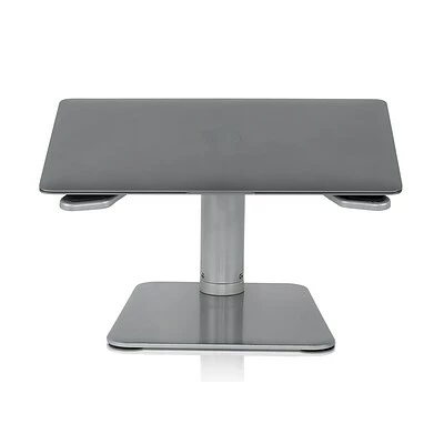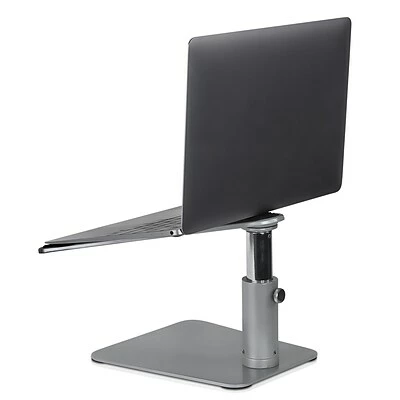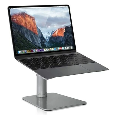 A modern stylish height adjustable laptop stand designed to improve the airflow and efficiency for MacBook laptops. Raise up your laptop, MacBook, Chromebook, Surface Book to a more comfortable height or align it with an external display. The top of the A-shaped platform is covered with an anti-slip silicone to firmly hold your laptop in place during use and padded feet under the base for stand stability. The adjustable height laptop stand lifts between 4.7 inches to 6.7 inches to work more ergonomically and help reduce neck and back pain. An angled tray reduces glare and eye strain making it easier to read the screen. Ergonomic laptop stands improve your ability to work for longer periods of time becoming more efficient in your work flow. Raising the MacBook not only increases productivity and ergonomics, but it also increases air flow around the laptop and improves cooling and performance. All necessary instructions and hardware included.