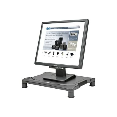 The Tripp Lite universal monitor riser stand helps to raise a monitor from 1.25 inches to 5.5 inches above the desk surface, easing eye and neck strain. This stand frees up valuable workspace and holds up to 40 pounds of laptops, monitors or printers. Its extra-large, 15.5 inches by 11.25 inches platform firmly holds the stand in place while the rubber feet prevents the stand from sliding on smooth surfaces. This stand is easy to assemble and is perfect for home or office use.