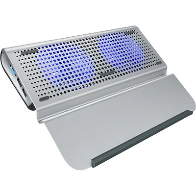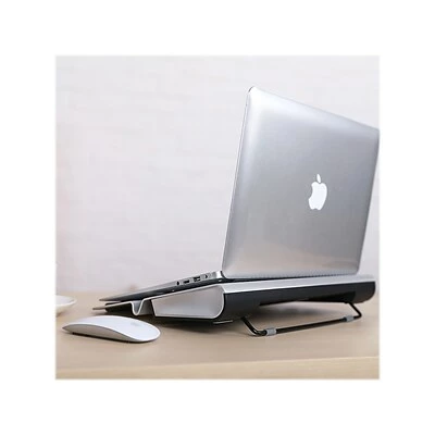 The OTM Essentials aluminum large laptop riser stand features nonslip padding to hold the laptop securely in place and cooling fans to help keep the laptop ventilated. Tilted design allows for maximum comfort. Great for 12″-15″ laptops.