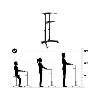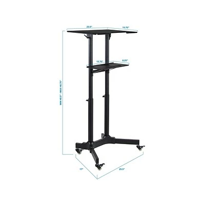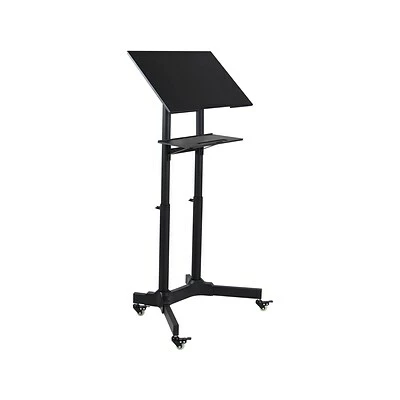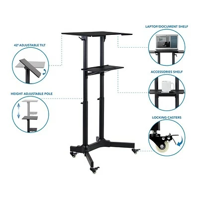 Features top platform and accessory shelf, can be used as a mobile laptop cart, portable podium, or presentation lectern