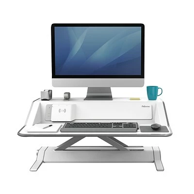 Sit-Stand with charging station. Features 22 different height settings and 17โ of vertical adjustment so you can work in a position thatโs perfect for you.