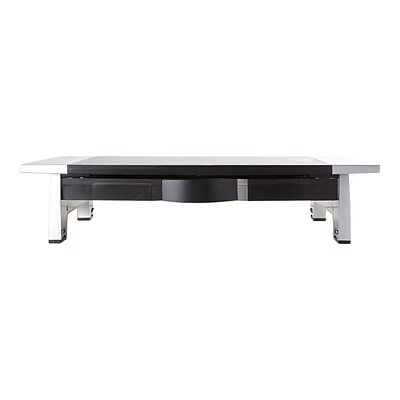 The Fellowesยฎ Office Suitesโข Monitor Riser places your monitor at a comfortable viewing height to help prevent neck strain! Designed to support up to 80 lbs. and elevate monitor to maximize workspace. Height adjusts up to 2-ยฝโ (between 4โ and 6-ยฝโ) for optimal viewing angle. Stow laptop underneath for in-office use and extra desktop space. Storage tray organizes business essentials for easy access. Non-skid rubber feet protects work surface from scratches or scuffs.