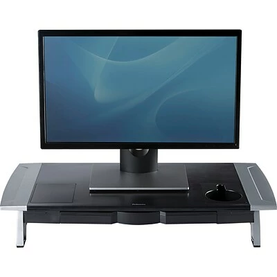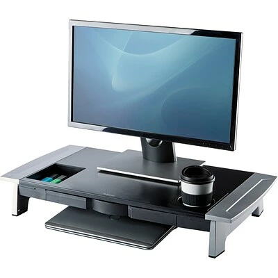The Fellowesยฎ Office Suitesโข Premium Monitor Riser helps reduce shoulder, neck, and eye strain by positioning monitor or laptop at a comfortable viewing angle! Adjustable feet allow optimal height positioning – viewing angle can be customized up to 2-1/2โ for a total height between 4โ and 6-ยฝโ. Includes cup holder and media storage plus storage drawer for supplies. Stows laptop underneath for space-saving storage and supports monitors up to 80 lbs. Non-skid rubber feet protects work surface from scratches or scuffs.