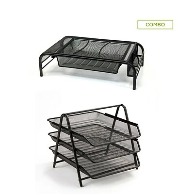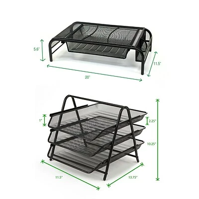 Monitor Stand: Raises your monitor to a comfortable viewing height, while reducing neck and eye strain. ; Letter Organizer: 3 Mesh slide trays that allow easy access to paperwork or office supplies