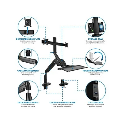 This sit/stand desk mounted workstation turns an existing desk into a more active workspace quickly, with easy installation using a C-clamp or grommet base. Experience a more comfortable way to work throughout the day by adjusting the full-motion fluid gas spring arm and the full-motion monitor mounts. This workstation features two USB 3.0 ports, for charging or data transfer, in the front of the mount, keeping CPU connection within reach and easy to access.
