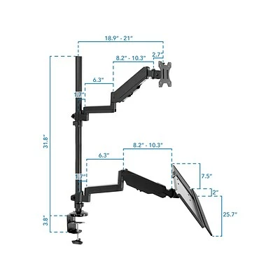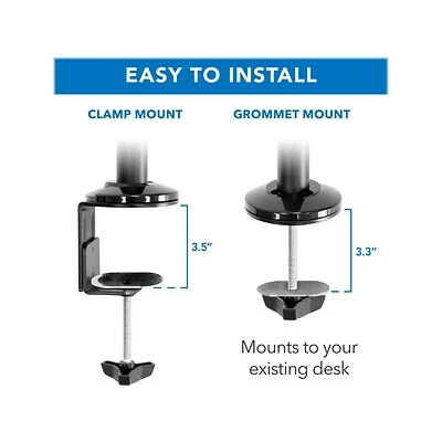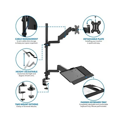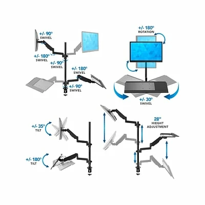 Mount your screen up to 32″ in size in either portrait or landscape orientation. The intuitive 25.7″ x 9.5″ keyboard tray underneath comes with a padded wrist rest to relieve additional stress on your wrists. Cable management system hides unwanted cables and wires from sight. The pneumatic counterbalance gas springs allow your monitor to tilt 35 degrees, swivel 180 degrees, and rotate 360 degrees so you can find the optimum viewing angles. Clamp or grommet onto your work desk.