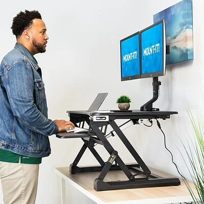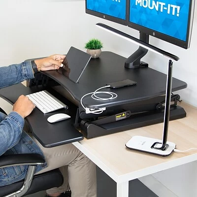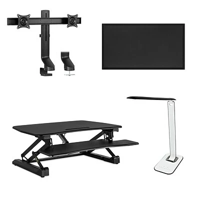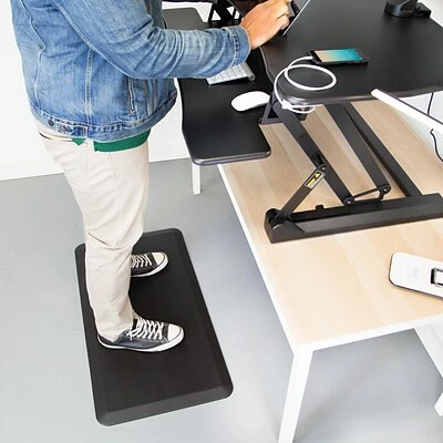 This ergonomic workstation bundle features an electric sit stand desk converter designed to make the transition from sitting to standing seamless and smooth. Paired with our dual monitor mount, which is designed specifically for standing desk converters, our anti-fatigue mat and our LED desk lamp, this bundle is sure to revamp your workspace and your productivity. The dual monitor mount featured in this bundle has a low profile c-clamp base, allowing for your sit stand desk to adjust to its lowest position, unobstructed. Find the perfect settings on the adjustable LED desk lamp to brighten up your space and adjust the color temperature settings to either a cool or warm tone. Convert your existing desk into a sit stand workstation with this preassembled standing desk converter. Simply place this on your desk to create a healthier workstation. The dual monitor mount is designed specifically for standing desk converters. It features a shallow base so the converter can lower to its lowest level without obstruction. Our Relaxalight LED Desk Lamp features 7 levels of brightness control, temperature color settings and includes a USB port to charger your devices. Pair your height adjustable standing workstation with a soft anti-fatigue mat, designed to eliminate or reduce pain while standing for long periods of time.