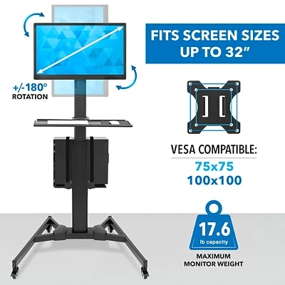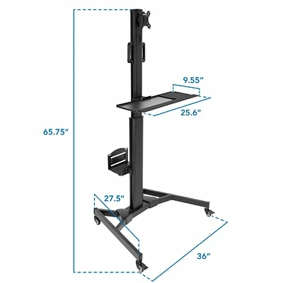 A rolling mobile PC workstation with monitor mount designed for versatility and productivity. Roll this unit from room to room with ease, then lock it in place using the locking casters. Great for home, office, trade shows, and more. The height of both the keyboard tray and the monitor mount easily adjusts, allowing you to create the perfect setup tailored to your height.