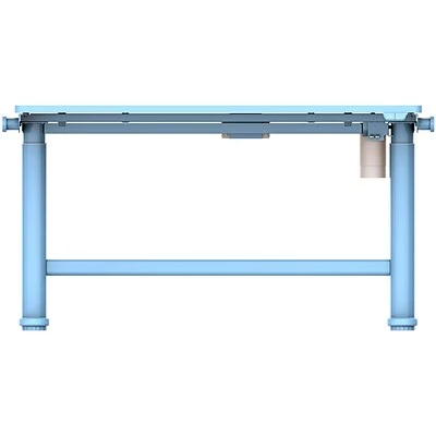 Electric blue desk with sturdy metal legs that keep tabletop level