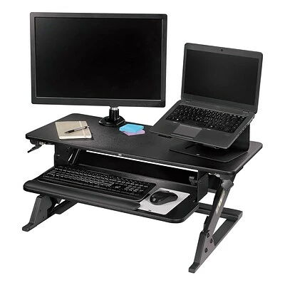 Primary work surface is 35.4″ W x 23.2″ D and is large enough to fit two 24ā monitors and holds up to 35 lbs