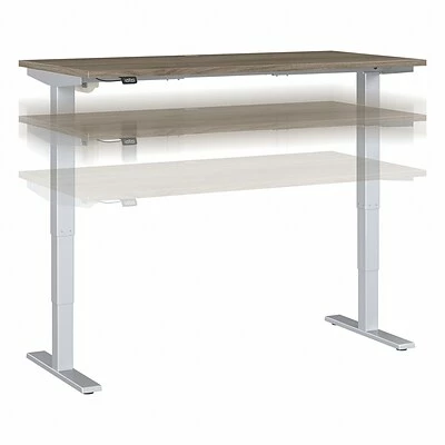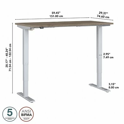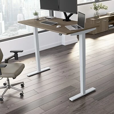 The Bush Business Furniture Move 40 electric height-adjustable standing desk is a perfect way to build an ergonomic workspace without the high-end price tag. Give your body and mind a break from sedentary work and enjoy a healthier, more productive office with the push of a button. Three-stage units lift the desktop anywhere from 28″ to 48″ at a speed of 1.25″ per second, so you can change positions without missing a beat. The adjustable desk also features an anti-collision sensor that stops movement up or down if an object is detected. Available in several finishes, the durable thermally fused laminate work surface resists scratches and stains, while a welded 16-gauge steel base allows the desktop to support up to 176 lbs. This sit-stand desk is tested to meet ANSI/BIFMA quality standards for safety and performance and is backed by a 5-year manufacturer’s warranty.