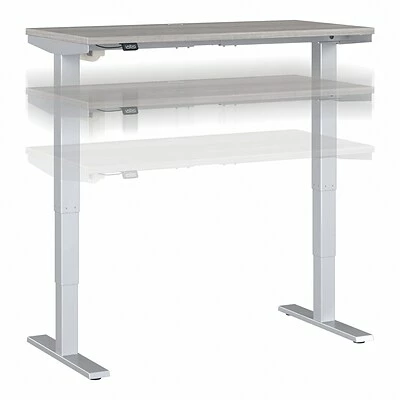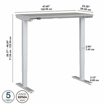 The Bush Business Furniture Move 40 electric height-adjustable standing desk is a perfect way to build an ergonomic workspace without the high-end price tag. Give your body and mind a break from sedentary work, and enjoy a healthier, more productive office with the push of a button. Three-stage units lift the desktop anywhere from 28″ to 48″ at a speed of 1.25″ per second, so you can change positions without missing a beat. The adjustable desk also features an anti-collision sensor that stops movement up or down if an object is detected. Available in several finishes, the durable thermally fused laminate work surface resists scratches and stains, while a welded 16-gauge steel base allows the desktop to support up to 176 lbs. This sit-stand desk is tested to meet ANSI/BIFMA quality standards for safety and performance and is backed by a 5-year manufacturer warranty.