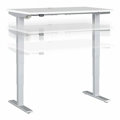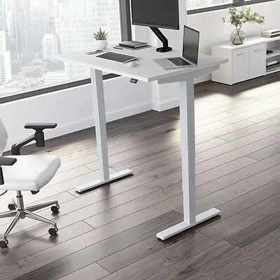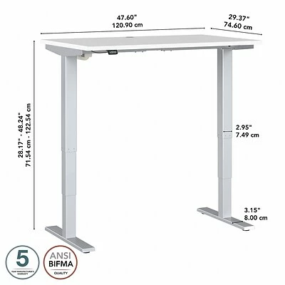 The Bush Business Furniture Move 40 electric height-adjustable standing desk is a perfect way to build an ergonomic workspace without the high-end price tag. Give your body and mind a break from sedentary work, and enjoy a healthier, more productive office with the push of a button. Three-stage units lift the desktop anywhere from 28″ to 48″ at a speed of 1.25″ per second, so you can change positions without missing a beat. The adjustable desk also features an anti-collision sensor that stops movement up or down if an object is detected. Available in several finishes, the durable thermally fused laminate work surface resists scratches and stains, while a welded 16-gauge steel base allows the desktop to support up to 176 lbs. This sit-stand desk is tested to meet ANSI/BIFMA quality standards for safety and performance and is backed by a 5-year manufacturer warranty.