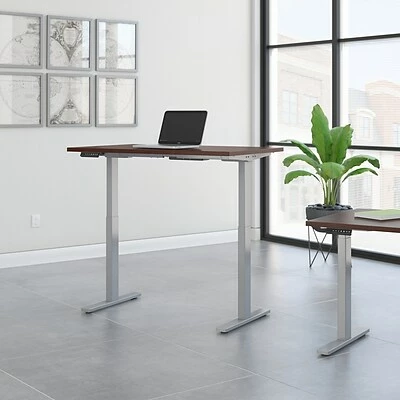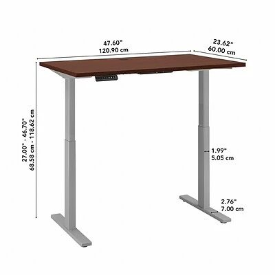 Have a healthy and productive day at the office with the Move 60 by Bush Business Furniture 48W x 24D Height Adjustable Standing Desk. Those who use sit to stand desks report improved attitudes, energy and comfort while getting more done, and the Move 60 provides an affordable solution. The electric adjustable height Desk smoothly lifts from a low of 27 inches to a high of 46.7 at the push of a button. Store your favorite heights with four programmable presets. The ergonomic Desk withstands years of everyday use. A durable thermally fused laminate finish resists scratches and stains, while the sturdy steel base creates a weight capacity of up to 200 pounds. This sit to stand Desk will have no problem holding all of your work materials. Backed by a 5 Year Warranty, the Height Adjustable Standing Desk meets ANSI/BIFMA quality test standards.