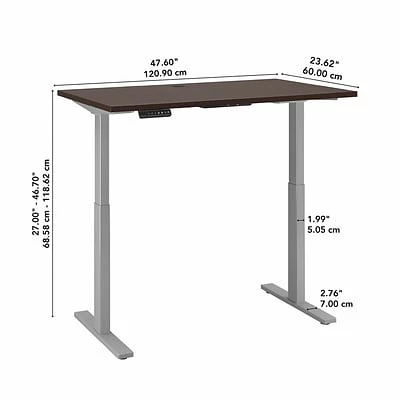Have a healthy and productive day at the office with the Move 60 by Bush Business Furniture 48W x 24D Height Adjustable Standing Desk. Those who use sit to stand desks report improved attitudes, energy and comfort while getting more done, and the Move 60 provides an affordable solution. The electric adjustable height Desk smoothly lifts from a low of 27 inches to a high of 46.7 at the push of a button. Store your favorite heights with four programmable presets. The ergonomic Desk withstands years of everyday use. A durable thermally fused laminate finish resists scratches and stains, while the sturdy steel base creates a weight capacity of up to 200 pounds. This sit to stand Desk will have no problem holding all of your work materials. Backed by a 5 Year Warranty, the Height Adjustable Standing Desk meets ANSI/BIFMA quality test standards.