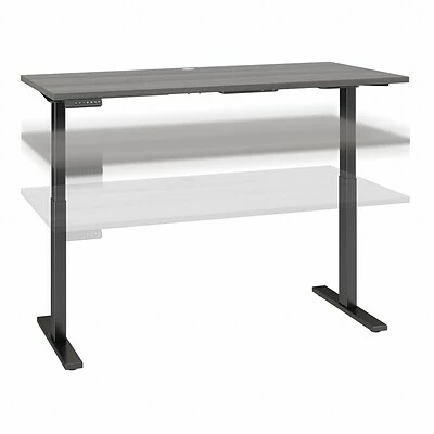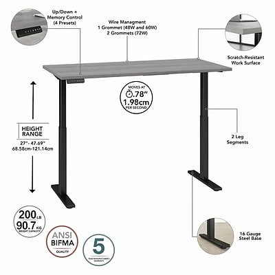 Have a healthy and productive day at the office with the Bush Business Furniture Move 60 electric height-adjustable standing desk. Those who use sit to stand desks report improved attitudes, energy, and comfort while getting more done, and the Bush Business Furniture Move 60 provides an affordable solution. The electric adjustable desk smoothly lifts from 27″ to 46.7″ at the push of a button. Store your favorite heights with four programmable presets, so you can use them as often as you like. The ergonomic desk withstands years of everyday use. A durable thermally fused laminate finish resists scratches and stains, while the sturdy steel base creates a weight capacity of up to 200 lbs. This sit-to-stand desk will have no problem holding all of your work materials. Backed by a 5-year warranty, the adjustable standing desk meets ANSI/BIFMA test standards.