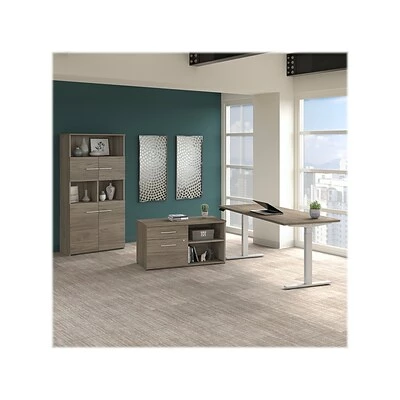 Bundle includes: 71.02″W x 29.37″D height-adjustable standing desk, 44.21″W low storage cabinet with drawers and shelves, 35.67″W five-shelf bookcase with doors