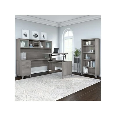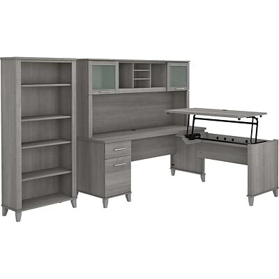 The Bush Furniture Somerset adjustable desk with hutch and bookcase offers an ergonomic solution for the home or small office. This furniture set is a perfect solution for those seeking for a stylish and functional ergonomic workspace. The mechanical Lift-n-Lock system allows the 42″W x 24″D return to lock into place at standing heights of 35″, 38″, and 41″ and easily return to a seated position. The 72″W x 24″D office desk has its own storage with a box drawer for supplies and a file drawer that holds legal- and letter-size documents. The hutch adds two frosted glass doors for concealed storage as well as open cubby spaces with two shelves. The bookcase features two fixed shelves and three shelves that can be adjusted. Fixed surfaces are tested to meet ANSI/SOHO standards for safety and performance while the mechanical lift is rigorously tested to Bush Furniture’s own quality standards. Backed by a 6-year manufacturer warranty.