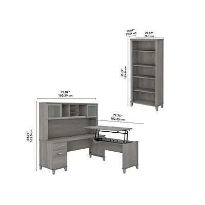 Bundle includes: 72″W office desk with drawers, 42″W sit to stand return, 72″W hutch, 30″W five-shelf bookcase