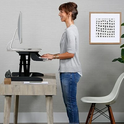 Ideal for single monitors or notebooks, this compact standing desk converter allows you to turn your work surface into a height-adjustable standing desk with one simple movement. Itโs that easy. Together with a cable-free worksurface and comfortable keyboard tray, the WorkFit-Z Mini is an office essential for incorporating movement into your work day.