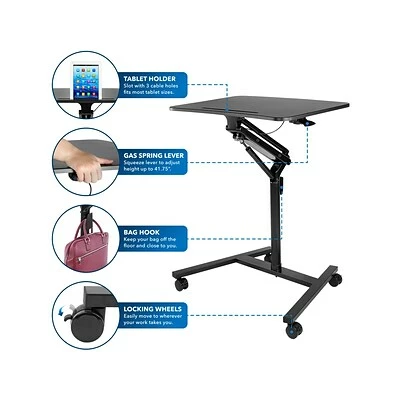 This Mount-It! portable desk offers an easy way to set up and position your computer or A/V equipment. The locking casters provide mobility, and the tilt feature gives you the ability to adjust your equipment to a perfect position. The gas spring makes adjustments up and down a breeze. Enjoy this well-built, sturdy stand for years to come.