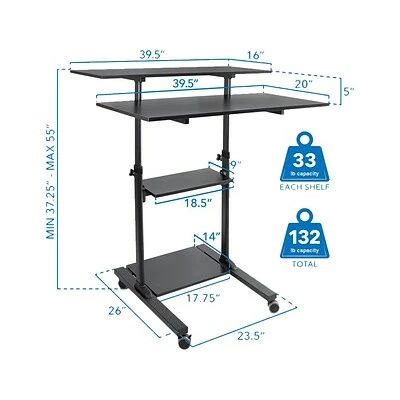 Height-adjustable desk is great for use as a mobile computer/laptop station for office, home, hospitals, showrooms, and classrooms