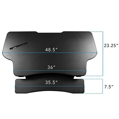 This sit-stand desk converter sits on top of your existing desk and allows you to work comfortably from either a sitting or standing position. Gas spring lift mechanism makes height adjustment almost effortless. The desktop platform and keyboard tray are large enough to support monitors, laptops, keyboard, and mouse side by side. Start experiencing the benefits of standing with this desk converter. It’s an easy, quick, and affordable way to transform your desk setup into a more active workspace. Enjoy the freedom of continuous height adjustment for a custom fit. Desk height adjusts from 6 inches up to a maximum 19.25 inches.