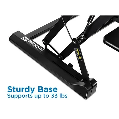 The MI-7955 stand desk suits a variety of needs and heights. Adjust the table down from 6 inches while you sit, and raise it up to 19.25 inches to stand. The desktop measures at 35 inches wide, and provides plenty of space for multiple monitors, a laptop, and even a tablet. The slot on the front of the desk can be used to prop up a phone or tablet for easier viewing. The second tier keyboard tray is spacious as well, and leaves plenty of room for a full size keyboard and mouse. Ergonomic posture is important to prevent eye strain, neck and back pain. Monitors and keyboards should be raised to an ergonomic height to attain healthy posture while working. Standing during your workday will increase your energy, alertness, and productivity, and this height adjustable desk riser can help you achieve that.