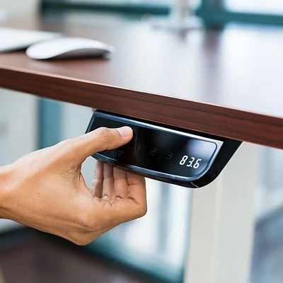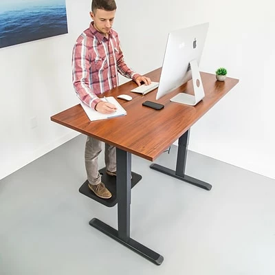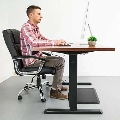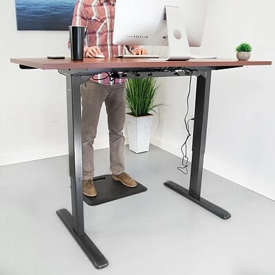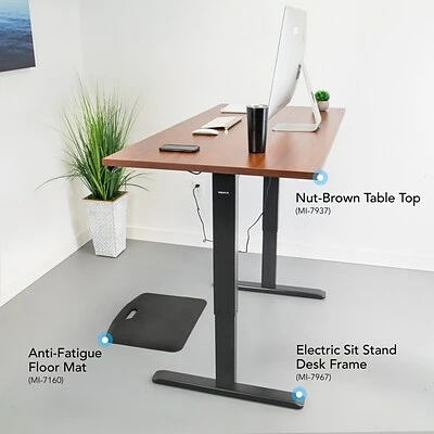 Transform your workspace into a healthy sit stand workstation that adapts to you and allows you to move more throughout the day. This electric standing desk frame paired with our easy to clean nut-brown tabletop is designed to look good in any space, while keeping you healthier throughout your work day. Our soft anti-fatigue mat is the finishing touch in this bundle and allows you to stand for longer periods of time, by reducing the pain and discomfort usually felt by standing on hard surfaces.Electric standing desk frame makes the transition from sitting to standing easier throughout the day. Features an easy to clean nut brown finish tabletop and an LED digital touchscreen controller with programmable height settings and a timer function.The electric desk frame is height Adjustable from 28.5โ to a maximum height of 48โ, allowing you to customize the height throughout the day.It is important to pair your height adjustable standing workstation with a soft anti-fatigue mat, designed to eliminate or reduce pain while standing for long periods of time.
