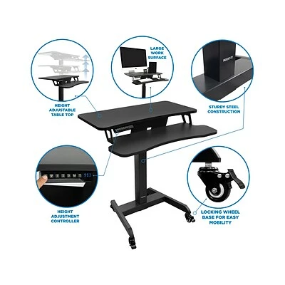 Maintain a healthy lifestyle and reduce back pain with this Rolling Sit-Stand Workstation! This desktop is electric powered and can be adjusted from standing to sitting by just a push of a button. The two-shelves offers room for your keyboard and monitor. Easily roll your workstation from room to room and lock it into place with its lockable casters.