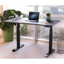 Height-adjustable legs provide 25.8 inches of adjustment from 25.6″ to 51.4″ high. 54″ wide top measures 28″ deep and has rounded corners. Dual-electric motors provide smooth and even height adjustment at 1.5″ per second. Ergonomically curved side for a more user focused workspace. Sloped desk top edges for extra legroom when lowered. MDF wood top. Easily accommodates dual monitor and laptop + monitor setups. Button-press digital controller with LED display and four memory settings. Industrial-strength steel construction for stability and durability. Includes screw-in leveling feet for sturdy operation on uneven surfaces. Base finished in black, top finished in black 3D laminate. Tested and certified to ANSI/BIFMA X5.5 compliance.