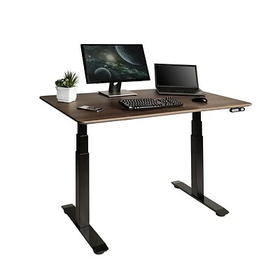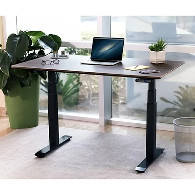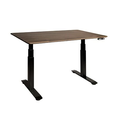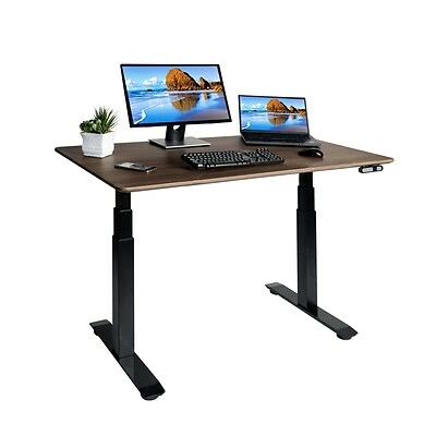 Height-adjustable legs provide 25.8 inches of adjustment from 25.6″ to 51.4″ high. 54″ wide top measures 28″ deep and has rounded corners. Dual-electric motors provide smooth and even height adjustment at 1.5″ per second. Ergonomically curved side for a more user focused workspace. Sloped desk top edges for extra legroom when lowered. MDF wood top. Easily accommodates dual monitor and laptop + monitor setups. Button-press digital controller with LED display and four memory settings. Industrial-strength steel construction for stability and durability. Includes screw-in leveling feet for sturdy operation on uneven surfaces. Base finished in black, top finished in walnut 3D laminate. Tested and certified to ANSI/BIFMA X5.5 compliance.
