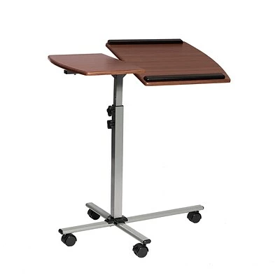 The Techni Mobili Deluxe Rolling Laptop Stand saves space while providing the laptop or writing setup you need. The main panel tilts so you can adjust it to the most ergonomic, comfortable working angle. It also features safety edge-stoppers to prevent objects from sliding off when the panel is tilted. You can also easily adjust the height from 30″ to 35″ with a dual knob system. The extended 4th leg provides increased stability. Two of the four non-marking nylon casters include locking mechanisms. The main tilting table panel has a 30lbs weight capacity, the stationary table panel has a 45lbs weight capacity and both are made of MDF with a moisture laminate veneer atop scratch-resistant powder-coated steel frame. Color: Mahogany.