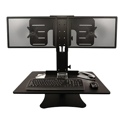 The wood construction on this dual-monitor desk converter keeps the unit sturdy, ensuring your computer and other work equipment stays secure. A laminate coating increases the durability of the piece, protecting it from scratches and other damage while giving it a sleek black appearance. The dual-monitor desk converter securely hold monitors up to 22 inches wide so they won’t shift or fall as you raise or lower the converter.