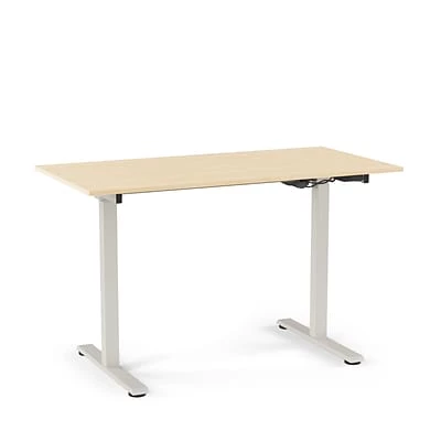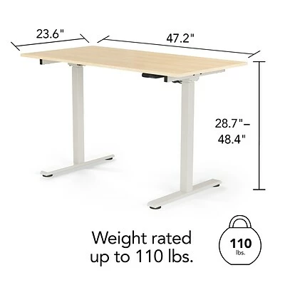 Alternate between standing and sitting for increased comfort with this 48″W desk. The single-motor lift system and intuitive two-button controls let you quickly adjust the desktop height from 29″ to 48″, and the two-stage column base provides stability without sacrificing legroom. Made with particleboard, the desktop offers lasting durability. This Union & Scale Essentials 48″W height-adjustable desk features a tabletop with a natural finish and gray metal legs to give your work area a sleek, modern appearance.
