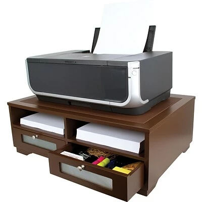 Durable MDF in an attractive brown finish with faux leather top keeps printer in place without scratching